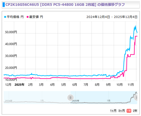 ちょっと流石にメモリの値段狂ってるDDR5の価格推移グラフ、北から見た南アメリカ大陸の断面かと思ったわ — 747_200Japan (@747_200Japan) November 30, 2025 https://kakaku.com/ ※PCパーツ(メモリ・SSD・HDD)の価格、生成AI向けのやつ優先による需給逼迫の表面化で爆上げ(2025/11/03) Micron社はコンシューマー向けSSDとRAMの生産を中止、AIへの注力強化に伴い重要な製品も廃止へ 貧乏臭い客向けのCrucialなんてブランドは廃止し、我々は金払いのいいAIのために全力を尽くす。金ない奴は〇ね — Lisaちゃん@PC自作 (@KotoriKanase) December 3, 2025 https://investors.micron.com/ うわもうマジでメモリの価格爆上げが止まらんぞヤバすぎる — ゆぅ~ (@realize_you) December 4, 2025 Crucialの決定がヤバすぎる細々とでも続ければAIバブル崩壊した時に帰ってこれるのにそれぐらいコンシューマー向けの利益率が悪く、エンタープライズ一本でいきたいってことですか — 大佐 (@TA1SA) December 3, 2025 一般消費者向け撤退というのは儲からないから撤退ね。儲からないというのは売れないではなく、メモリ需要が高いから大して儲からない消費者向けなんて作っていられない、という意味だからね — 暴れん坊症候軍 (@Abarenbo_S) December 3, 2025 DRAM需要、Samsung/SK hynix/Micron3社の供給能力の3倍とか言ってるしな — おろし🦈 (@oroshi_tea) December 4, 2025 完全な私見だけど2〜3年はメモリ使う部品は価格上がり続けて戻るのに10年はかかるぞ(戻らない可能性もある) — thorium02 (@thorium02) December 4, 2025 生産設備の納入待ちはどんどん長くなってるし、そもそもデータセンター向け需要の伸びがそれを上回りそうでおしまい — おろし🦈 (@oroshi_tea) December 4, 2025 ふざけてんなマジで — のらねこ!C107 12/31 南2 i39ab 中華パーツ自作PC本予定 (@ragemax) December 3, 2025 Crucialがなくなったら、どこのメモリーを選べばいいのか問題 — こまめブログ (@littlebeansinfo) December 3, 2025 マイクロンの消費者向けブランドのSSDがなくなってもそんなに困らないけどメモリは「とりあえずこれ買っとけばいいか。安いし」の選択肢がなくなるの困るね? — ねこ吸い (@8796n) December 3, 2025 メモリモジュールメーカは3種類(おおざっぱ)1)チップ会社ブランド CucalやSamusun、Hynix2)上記から長期契約でチップ買い製品化 ADATA、ADTEC等3)検査基準を緩めたチップやウエファー買でイールドを上げ低価格化。中華系に多い3)は明らに信頼性低い。明言さけますが1年で半数劣化とか — ゆずき (@uzuki425) December 4, 2025 Samsungも自社製品(Galaxy)にすらメモリ作らなくなってるから中国が入ってこなかったら相当ヤバいんじゃ…三大メーカーもうSKhynixしか残ってないじゃん — イアラ (@iar_kuro_kuru) December 4, 2025 もう一般人は恐らく中国系の名前を聞いたこともない無い謎のメーカーのモノをいつ故障するかと怯えながら使うしか無い時代なんだ😭 — Pocαri (@pcr_pk) December 4, 2025 マイクロン程の巨大企業が撤退するって考えると、曲がりなりにもコンシューマー向けにGPU作ってるNVIDIAはまだ良心的なのかもしれない — いんぐれ (@inger_T_an) December 3, 2025 MicronがCrucialやめますってのは終わりの始まり。 NVIDIAがGeForceやめますとか、AMDがRyzenやめますとか言い出したら本当の終わり。 — 国崎こま (@KomaTAS) December 4, 2025 これから先、特にゲームできるPCは高騰どころか、存在するかも怪しい代物になります。少しでもゲーミングPCを買う気があるなら今あるBTO在庫に死ぬ気で飛びつくのだ — 吾和井(あわい) (@away_san) December 3, 2025 あのさあ、AI特需でパーツ高騰!とかいうけど消費者向けパーツ消滅してパソコン買えなくなるまで行ったらパソコン無きゃそもそもAI使いようがないと思うんですが — うみゆき@AI研究 (@umiyuki_ai) December 4, 2025 https://stockcharts.com/sc3/ui/?s=MU Source: 市況かぶ全力2階建 投稿ナビゲーション メモリ需給、さらに逼迫か Micronが消費者向けメモリ、SSDから撤退 【朗報】丸亀製麺「クリスマスイブは夜営業せず休みにします」
