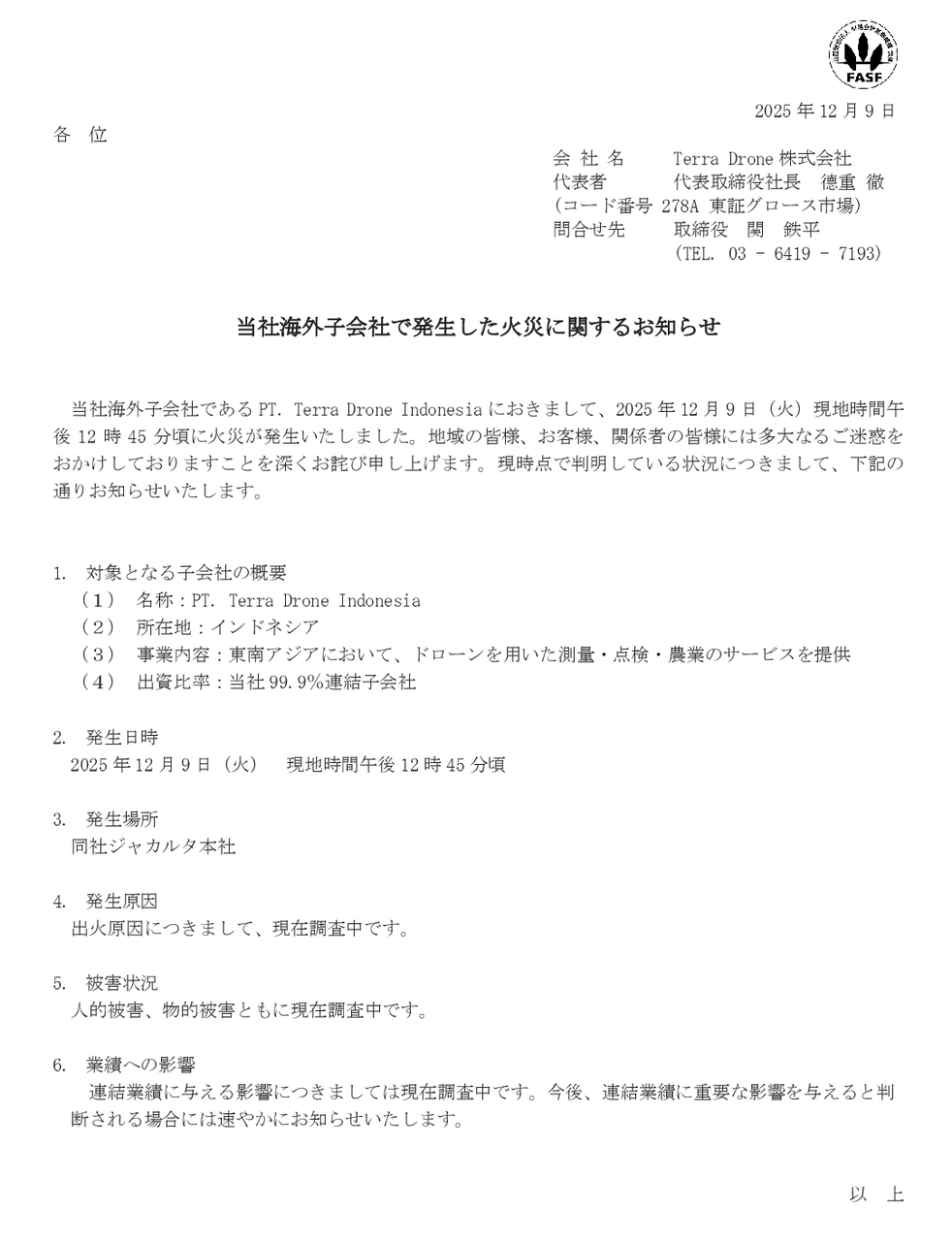 ジャカルタの火災、少なくとも22人も亡くなられたようだけど、テラドローンのビルか。テラドローンのインドネシア子会社のジャカルタ事務所らしく、テラドローンからもリリース出てるね。