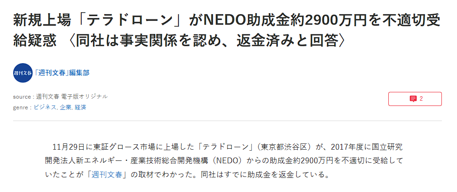 ちょうど一年前のIPO早々にNEDO助成金不正受給ぶち込まれてたの pic.twitter.com/7z3uYGVGwU