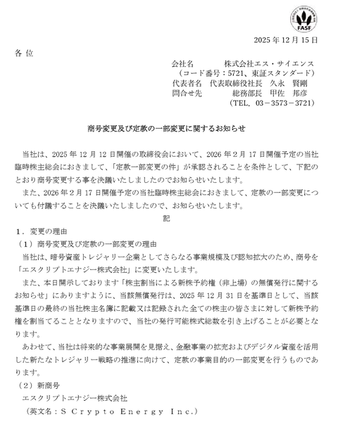 志村化工(エス・サイエンス)、また社名ロンダリングするのかよ。しかも名前にクリプト — ほっけタソ (@HokkeTaso) December 15, 2025 https://s-science.jp/ 日本の上場企業エス・サイエンスが、暗号資産トレジャリー企業に完全シフトすることを発表しました ✅社名を「エスクリプトエナジー」に変更✅中期目標は1000BTC保有(約139億円)✅株主に新株予約権を無償配布(行使価格は株価の50%)✅全て行使された場合、最大220億円分のビットコインを購入 pic.twitter.com/Tzb0IdKuVR — アンゴロウ@暗号資産 (@angorou7) December 15, 2025 https://s-science.jp/ もう仮想通貨会社になったな…… — あしもとよいか (@ayoika) December 15, 2025 青汁王子はZOZO前澤を参考にして第三電力やるんだろ?んで株主優待で電気代ポイントとか出しそう — れいろう (@N5Sjd02tEM86548) December 15, 2025 いまだにビットコインで上がるんかい — にゃんたまω (@nyantama2323) December 15, 2025 仕手株とお泊りしちゃ駄目だよ。パーティ会場が一番盛り上がってる時に裏口からそっと帰るに限る。 — 急樂 (@0110110w) December 8, 2025 投機家の僕がこんな事を言うのもなんなんだけど、ビットコイン買ってるだけの企業が時価総額1兆円で、地域経済や雇用に多大な貢献をしている大手製造業が数千億円って明らかにおかしい。ビットコイン買うだけの企業の社会的価値は0だよ。勿論僕のような投機家の社会的価値も0だけどね。 — 塩漬けマン@投機ブログ (@shiozukemann) September 9, 2025 ※主な「ビットコイン始めました」上場企業 ・株券印刷によるビットコイン1点賭けに勝利し瞬間時価総額1兆円を達成したメタプラネット ・電力小売屋のリミックスポイント ・中華系株券印刷業のビート・ホールディングス・リミテッド(旧・新華ファイナンス)・大型上場ゴール企業のgumi・解体の窓口のバリュークリエーション・青汁王子が広告塔のエスクリプトエナジー(旧・志村化工→エス・サイエンス)・ゲーム屋のenish(エニッシュ)・服屋のマックハウス・自動車部品屋のイクヨ・オンラインクレーンゲームが主力のサイバーステップ・求人広告のイオレ・AIフュージョンキャピタルグループ(旧フューチャーベンチャーキャピタル)・単なる安い服屋で事業再生中のANAP・無料ゲーム屋の東京通信グループ・上場3年で子会社で粉飾決算のアジャイルメディア・ネットワーク ・社名ロンダリング4回のフォーシーズHD ・ネイル屋のコンヴァノ ・社名ロンダリング4回のクオンタムソリューションズ ・呉服問屋のBitcoin Japan(旧堀田丸正)(米Bakktの裏口上場) ・九州の注文住宅メーカーLib Work(リブワーク) ・デジタルギフト屋のデジタルプラス ・東京ガールズコレクションのW TOKYO ・社名ロンダリング2回のDef consulting(旧ぱど→旧Success Holders) ・コスメ屋のパス(旧イー・キャッシュ) ・服屋のスターシーズ(旧シーズメン) ・漫画全巻ドットコムのTORICO 社名テキトーすぎだろw — 増井 (@miraclemasui) December 15, 2025 社名を変えたことを発表することが目的だから、なんでもいいよね。だから社名を考えることに時間をかける意味がない。効率的に仕事をできるいい会社や() — おいしさ (@oishisa_kabu) December 15, 2025 先日懲戒処分になったある弁護士が名字と事務所の場所と事務所名変えて再スタート切ってるんですけど、まあ、そこまでやったらなかなか過去は追えませんかね。 しかし名字まで変えるとはすごいなあ。 — スロー弁護士 (@Slowlife2B) September 12, 2025 こんなのがスタンダード枠に入っているのがおかしいやろ — マグ倫 予想屋&料理研究家 (@Mag_rin31) December 15, 2025 Source: 市況かぶ全力2階建 投稿ナビゲーション 【画像】東京都民「妥協して足立区や江戸川区で探してるのに、なんでワンルームが10万もするの…?」 Gmail、外部メール利用不能まであとわずか 「2025年中に移行を」呼びかけ続く