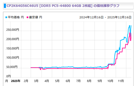 Crucial Pro CP2K64G56C46U5 DDR5-5600 64GBx22025年 5月18日 ¥ 48,100円2025年11月28日 ¥158,000円2025年12月 6日 ¥198,000円2025年12月15日 ¥239,580円(;・ω・)異様な勢いで値上がってるけど、この価格で買う人いるのか…? — 鬼虫兵庫 Hyogo Onimushi (@ONIMUSHI_HYOGO) December 15, 2025 https://kakaku.com/ サム・アルトマンのメモリ買い占め。本当なら翔太の寿司の笹寿司ムーブじゃん。全世界に影響与えてるけど……。 — みなかみしょう@新作発売中 (@shou_minakami) December 9, 2025 ※サム・アルトマンのOpenAI、競合他社への嫌がらせのため札束で殴って世界のメモリの4割を買い占めか(2025/12/09) ソフトバンクGがOpenAIに出した金でメモリ価格が上がってると考えてもいいのかなぁ — believe × (@airbe) December 11, 2025 PCやパーツが時価のお寿司みたいに毎時値上がりしていくこの地獄みたいなタイミングで… — かぶち (@3kn8) December 14, 2025 ・ソフマップ、2時間で値上がり ソフマップでいいなと思ってたパソコン見に行き直したら2時間前より一万近く値上がってて草ソフマップ価格って時価なんか… — 瀬良 (@Sera_tytk) December 11, 2025 ・1時間で値上がり うそやろ…外出してたこの1時間ちょっとの間に、カスタマイズで選択してたメモリの価格が44040円から78650円に値上がりしとる。 — 九十九@火曜 西1 ほ-40a (@tukumo99) December 12, 2025 ・(価格は)店員に相談 ゲーミングPC、先々週は金額書かれてたんだけど、先週行ったら『店員に相談してください』って書いてあって時価になってたので購入検討してる人はなる早がいいかもしれないです — ナギ (@yu_kiFF14) December 15, 2025 ・ソフマップ、価格表示ボードを時価に変更 ついに祖父も「時価」導入😭 pic.twitter.com/T66llbB5nx — DebepikaPC (@DebepikaPC) December 15, 2025 ・旧々世代のDDR3メモリまで少し復権 DDR3が人権を取り戻している pic.twitter.com/JSHRbvfZ3k — nonnbiri/ふじ丸🐈 (@nonnbiri_maru) December 12, 2025 ドスパラとパソコン工房見たけど、メモリもストレージも高くて泣いちゃった。もう2年はパソコンの改修しません。 — ばいぱー (@vpr_r) December 16, 2025 パソコンを買うのは今は時期が悪いおじさんが「今すぐ買え!!間に合わなくなっても知らんぞ!!」と大声で叫ぶレベルのラストチャンスが来たようだな。 — 伊藤 祐策(パソコンの大先生) (@ito_yusaku) December 11, 2025 フロンティア → 値下げ期待してセールページ更新したら一瞬で4万値上げ マウスコンピューター → 一晩中いろいろ選んでたら突然販売停止に ワイはアホや — SGR (@SGR77777) December 16, 2025 うおー滑り込みセーフだったな — ユニップ (@unippu_) December 16, 2025 価格動向追ってたからわかるけど、マウスコンピュータとかが言ってくれてた「いますぐPC買った方がいい」ってのは、買い煽りじゃなくてマジで親切心での忠告だからな… — nutu_wwwwwww (@nutu_wwwwwww) December 16, 2025 もうパニック買いやな — タケ (@bunnyatake) December 16, 2025 パソコン屋の株価が上がってるけど、売上はともかく利益的には逆に苦しいんじゃなかろうか。あまり妙味があるようにも思えないが — 空飛ぶスペさん (@kumakuma7) December 13, 2025 https://kabutan.jp/stock/chart?code=6670 なんかもう暴騰前に今BTOで組んだ場合より10万近く安く買えてるのでPC難民をみてると無限にニチャれるのよろしくないよほんと — れいさな (@reisana93) December 12, 2025 Source: 市況かぶ全力2階建 投稿ナビゲーション 【悲報】自民維新、議員定数削減は来年で確認WWWWWWWWWWWWWWWWWWWWWWWWWWWWWWWWWWWWWWWWWW 若者7割「忘年会参加したい」 コロナ禍経て意識変化か―民間調査