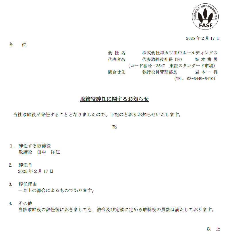 串カツ田中、田中洋江氏が一身上の都合で取締役を本日辞任