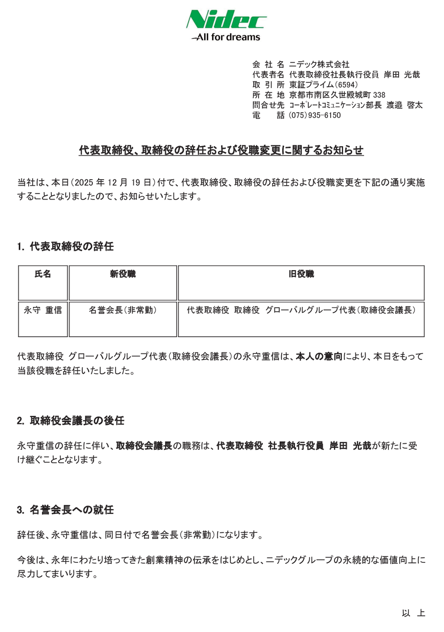 ニデック、代表取締役の永守重信氏が”本人の意向”により辞任。 pic.twitter.com/wX2lWf82dS
