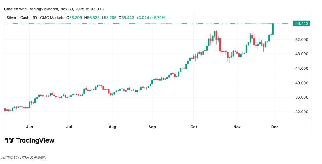 今週末、日曜日の午前10時(東部時間)に、銀の1オンスは$56.44で、過去24時間で米ドルに対して6%以上の上昇を記録しました。今週の数字はさらに、銀が14.1%上昇したことを示しており、過去1か月間では18.5%の上昇を見せています。2025年には小売購入者や中央銀行を含む大手機関から貴金属への強い需要が見られました。