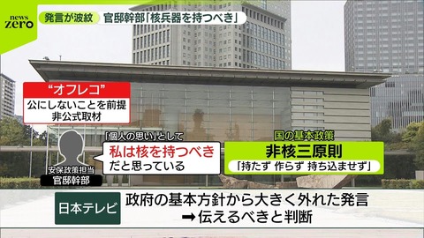 非公式とはいえそこまで踏み込むの…?まじでなんでそんな強気なん…? — くわお(岩尾) (@iwao_mushi_flog) December 18, 2025 https://www.youtube.com/ あれだ。核兵器の話した政府関係者。一番の失敗は「世の中で最低の倫理観しかもたない、マスコミというゴミを信じたこと」だ。 — もへもへ (@gerogeroR) December 19, 2025 ✕オフレコ発言を報道するのがおかしい◯記者生命を賭けて特ダネを手ぐすね引いて待っている人間が目の前にいて報道の意義があると判断されればオフレコ破りが何度も発生している状況の中で不用意な発言をするのがおかしい — 黒めがね (@krmgn) December 19, 2025 「日本は核保有すべき」発言各社の書き方 時事 政府高官共同 安保担当の官邸筋朝日 官邸幹部毎日 安保担当の官邸関係者 — Mr.HR (@MisterHR_japan) December 18, 2025 伝統的には「政府高官=官房副長官」だった気がしますが(官房長官は「政府首脳」)、今回のはどうなんですかね。他社は別の名前挙げてるから違う気もしますが。 — umedam (@umedam) December 18, 2025 官邸筋(不随意運動をして総理大臣を苦しめる筋肉) — さわやか行政サービス運動 (@MValdegamas) December 18, 2025 核戦争しないための核…メタルギア!? — あさぎトレード (@asagitrade_) December 19, 2025 核兵器を倫理的に断罪したところで、当の核兵器を保有する国家は減るどころか増えている事実を直視するべきでしょう。 — バルジ (@Bulge1994) December 19, 2025 核のない国なんて無理なんだよ、隣とその隣が核持ってんだから核廃絶だなんてMETAL GEAR SOLID Vのオーバーフローバグでしか実現出来ないんだって撃ったら撃たれる、やったらやられるってシンプルな大原則の前には一方的に撃てる撃たれるは余りにも脆弱なのよ — tkya (@tkya0318) December 18, 2025 核兵器に関する本当に必要な原則は「二度と日本に核兵器を撃たせない」のただ一つであって、余分な3つは要らない。 — しわすみ (@s_w_s_m) December 20, 2025 核武装をしても通常戦力を削れないので核武装は安上がりは間違ってるんよ。ただそこまでできたら日本の安全保障は間違いなく強化されるので例え高くてもやるべきという議論ならありやと思う。 — 三味線 (@f10523) December 21, 2025 高市内閣の支持率 オフレコ発言後にも関わらず、支持率が微減or微増を達成。 — watcher2-6 (@noedzNmnsljnesR) December 21, 2025 もうマスコミの印象操作受ける層は最初から支持してないのであまり影響ないんでしょうね — 🦊 (@japonica19111) December 21, 2025 核保有の議論よりも、立民岡田の「国民感情をコントロール」発言の方が何倍か民主主義の敵、独裁政治に直結する大暴言なんだけど? — 荒井禎雄(専業主夫を志望するフリーライター) (@oharan) December 21, 2025 これがリベラル仕草ってやつで「自分たちは国民より優れているから国民を善導しないといけない」とマジで信じているんですよ。いいサンプルなのでよく見ておきましょう↓立憲民主党岡田議員「高市発言を支持するような国民感情をコントロールしていかないといけない」 pic.twitter.com/2U03o18dt7 — 椎井蹴人 (@Cait_Sith_co) December 22, 2025 早苗さんも、中国苛つかせたらここまで支持率稼げると思ってなかったろうな — 中国住み (@livein_china) December 9, 2025 本質的な問題でなければ、支持率は維持出来そうだけど、問題は経済(政策的余地は少ない)になるかもね(´・ω・`) — lettuce (@lettuce26282613) December 21, 2025 いくら中央銀行が頑張っても政府が放漫財政やってたら円安は止まらないそして今の政府首脳に国民の痛みを伴うことをする覚悟なんてない — さけのみ犬 (@w3upi9yXjnhUcLR) December 19, 2025 Source: 市況かぶ全力2階建 投稿ナビゲーション 【画像】全入居者死亡マンションがこちら 【悲報】ワイのボーナス4万円