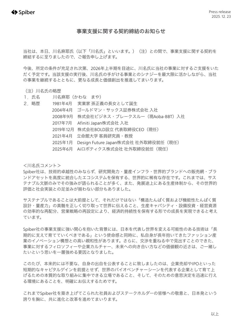 2025/12/23 Spiber事業支援に関する契約締結のお知らせ「川名麻耶氏との間で、事業支援に関する契約を締結」「実業家 孫正義の長女として誕生」「本来的には不要な、自身の出自を公表することに致しました」「企業売却やIPOといった短期的なキャピタルゲインを前提とせず、世界のバイオベンチャーシーンを代表する企業として育て上げるための本質的な取り組みに集中できる立場であること、そして、そのための意思決定を迅速に行える環境にあることを、明確にお伝えするため」
