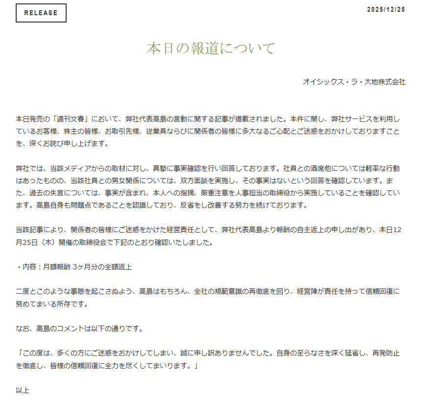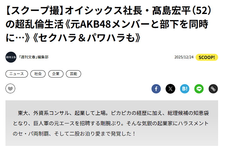 クリスマスイブにスッパ抜かれたオイシックス社長の下半身不祥事、セパ両リーグ制覇は流石に笑う。 pic.twitter.com/XR1GyhqDT5