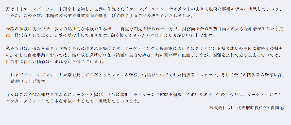 イマーシブ・フォート東京の営業終了について森岡毅代表コメント