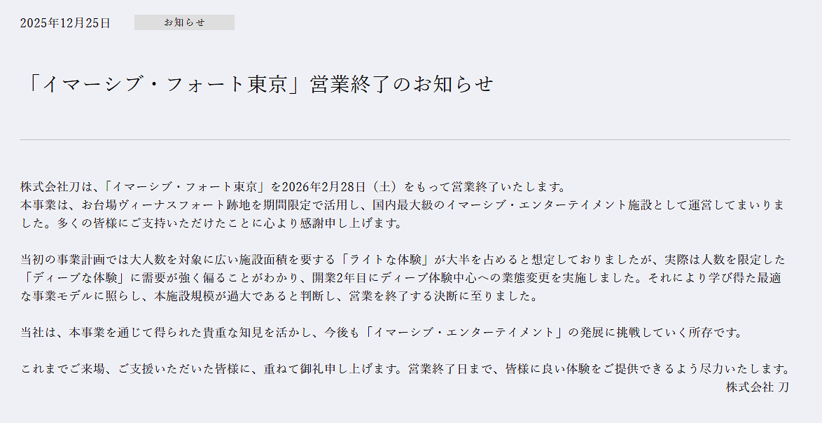 イマーシブ・フォート東京を運営する刀は、クールジャパン機構から80億円も出資を受けている訳で、その原資の一部は税金です。このインバウンドが爆発している追い風の中、2年で廃業とか洒落にならんだろ。