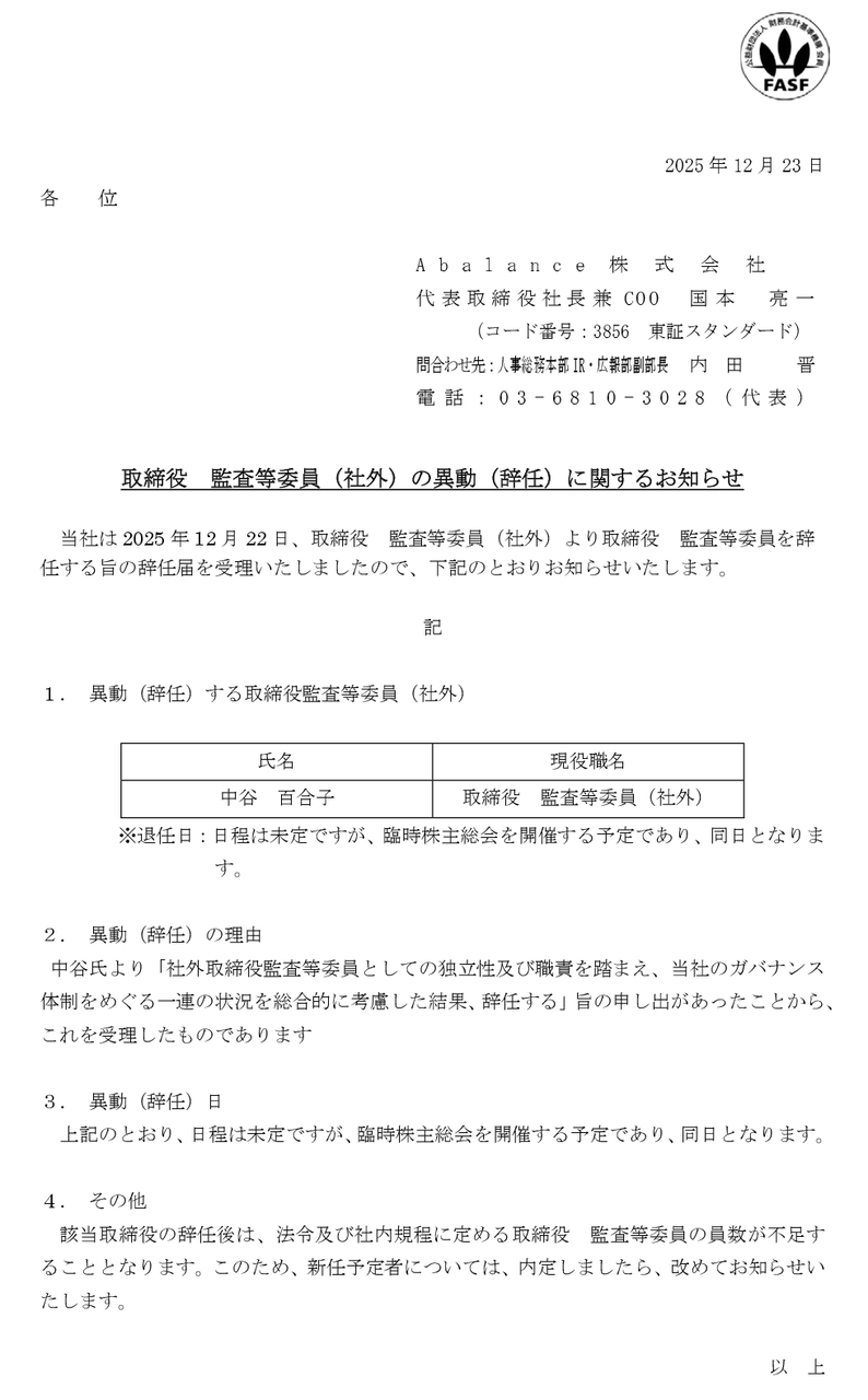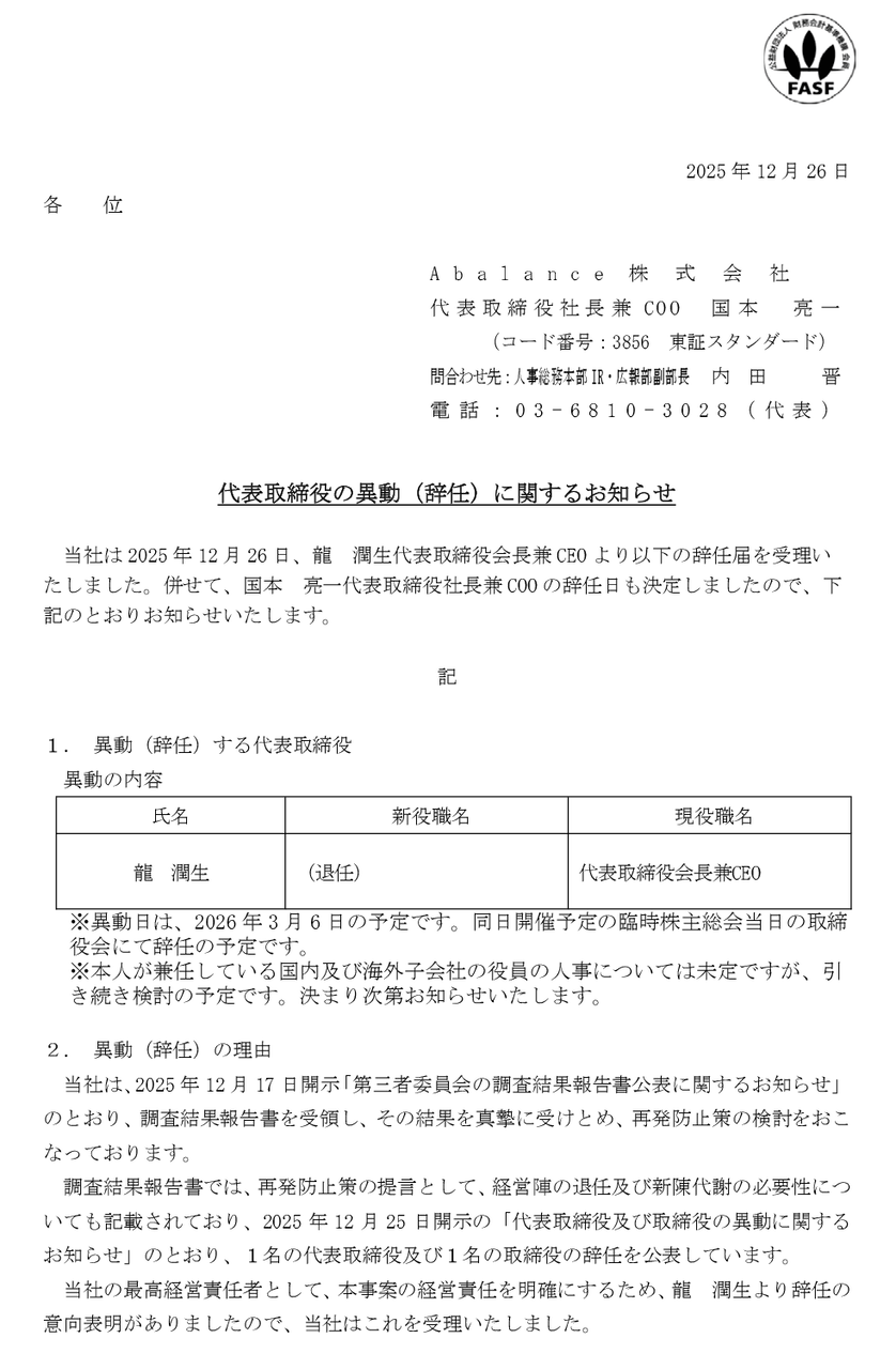 Abalance、代表取締役会長が辞任。(来年3月予定) pic.twitter.com/nWQxgtrXwF