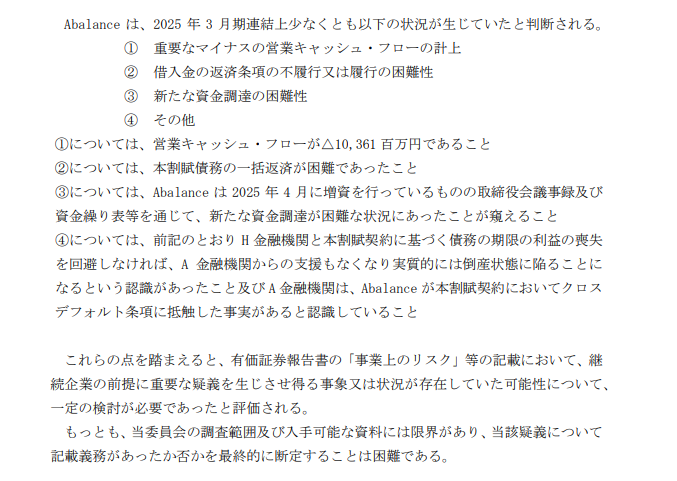売上の殆どを占める海外が大株主によりブラックボックス化、無謀な売電計画、記載漏れの保証債務、融資のための仮装入出金や請求書及び固定資産の減損損失回避、大株主への不記載貸し付け