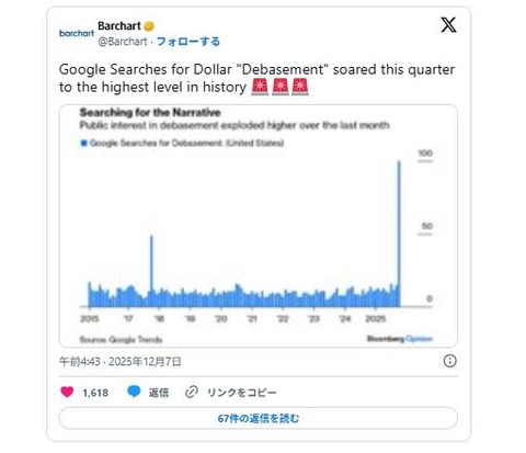 重要なポイント ドルの価値下落に対する懸念が前例のないレベルで高まっている。 暗号通貨のリーダーたちは、ビットコインが歴史的な4年周期から脱却すると予測している。 アナリストらは潜在的な弱気相場を警告している。 これらすべてはビットコインとその価格の将来にとって何を意味するのでしょうか? 米ドルの価値下落に対する懸念が新たな高みに達しており、同時に業界大手数人がビットコインの長年にわたる4年サイクルの終焉を予測している。 「ドルの価値下落」の検索数が記録的なレベルに達し、ビットコインの価格がわずかに回復する中、この二つの論調は、トレーダーやアナリストに、新たな変化する環境でビットコインがどう動くかを再考するよう促している。 これらすべてから、ビットコインの価格に何を意味するのかという避けられない疑問が浮かび上がります。 ドルの価値下落への懸念が史上最高に上昇 米ドル安に対する国民の不安が高まっており、それがオンライン検索活動の急増に反映されている。 Googleトレンドデータ「ドルの価値下落」という用語への関心が記録的なレベルにまで急上昇し、「ビットコイン」がそれに関連する急上昇キーワードとして登場していることがわかります。 BarChartによると、検索数は「今四半期に史上最高レベルに急上昇した」という。 ドルの価値の低下とは、通常インフレや積極的な金融政策によって引き起こされる通貨の購買力の低下を指します。 現在起こっている懸念は、持続的なインフレ圧力と米国連邦債務の急速な拡大に起因している。 CCNが以前報じたように、BRICS同盟の新たな金に連動したデジタル通貨は、何兆ドルもの貿易を米ドルから別の経路に変更することを目指しており、さらなる懸念を引き起こしている。 「このユニットは国内通貨と競合するわけではないが、依然としてドルの優位性に挑戦している」とCCNの教育チームは記した。 仮想通貨リーダーはビットコインの4年サイクルからの脱却を示唆 マクロ経済情勢が変化する中、仮想通貨業界の著名人らは、歴史的には半減期スケジュールによって推進されてきたビットコインのよく知られた4年周期の市場サイクルが衰退しつつあると予測している。 このサイクルは長い間、強気相場と弱気相場の局面を測るために使われてきました。 しかし、トム・リー、チャンポン・ジャオ(CZ)、キャシー・ウッドなどの業界リーダーは、ビットコインが成熟し、機関投資家の参加が深まるにつれて、そのリズムから切り離される可能性があると公に主張している。 Binance Blockchain Weekで、ファンドストラットのリー氏は、4年サイクルはもはや市場にとって信頼できる枠組みではないと主張した。 「我々はビットコインの4年サイクルを打ち破るつもりだ」とリー氏は聴衆に語った。 一方、アーク・インベストのCEOキャシー・ウッド氏は火曜日に次のように述べた。同氏は、大規模投資家が業界に参入する影響を指摘し、「4年周期は乱れるだろう」と述べた。 ウッド氏は「機関投資家によるこの新たな資産クラスへの移行によって、さらなる下落は防がれると考えている」と述べた。 また火曜日、ビットコインMENAでの講演でCZは次のように主張した。外部からの力が「4年周期を相殺するほど強力」になる可能性がある。 2026年は強気相場になると思うかと問われると、同氏はビットコインがスーパーサイクルに入っている可能性があると示唆した。 これらの大物に加え、Bitwise CEO の Hunter Horsley 氏も同様の意見を述べた。 Xの投稿で12月10日水曜日、ホースリー氏は「4年サイクルは終わった」とし、「市場は変わった」と明言した。 「2025年を振り返ると、2月以来の弱気相場だったことに気づくだろう。DATとビットコイン財務会社の容赦ない入札によってそれが覆い隠されていた」と彼は記した。 さらに、「2026年は素晴らしい年になるよう、すべてが順調に進んでいます。素晴らしいですね。」と付け加えた。 ビットコインの将来にとって何を意味するのか? ドルの価値下落と4年サイクルの終焉という2つの説が収束したことで、今後数か月でビットコインがどのように推移するかについて新たな疑問が生じている。 ビットコインは伝統的に、通貨価値の低下に対する懸念が強まると恩恵を受けてきた。 ビットコインは依然として変動が激しい資産ですが、法定通貨への信頼が弱まり、投資家が潜在的なヘッジ手段を求めるようになると、ビットコインの特性が注目を集めます。 同時に、ビットコインのよく知られた半減期サイクルの崩壊は、意味のある変化を意味するだろう。 半減期は4年ごとに新しいコインの発行を減らすことで供給を規制する一方、ドルの価値下落への懸念は投資家にインフレに強い資産を求めるよう促し、需要に影響を与える。 これらの力は、2020年から2021年のように連携できる。前例のない世界的な流動性と供給ショックが重なったとき、両通貨は独立して機能した。 ビットコ
