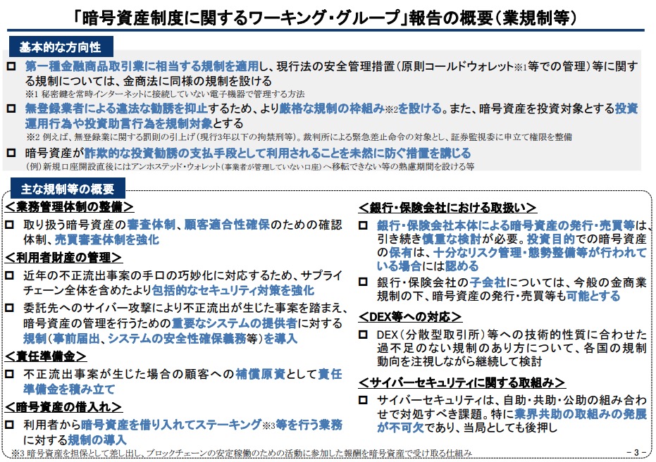 金融庁は12月10日、金融審議会「暗号資産制度に関するワーキング・グループ(WG)」の報告書を公表した。 その内容は11月26日の第6回会合で示された「報告書案」から実質的な変更はなく、暗号資産(仮想通貨)規制の根拠法をこれまでの資金決済法から金融商品取引法(金商法)へ移行する方針が正式に決定された。 今回の報告書は、7月から半年間にわたり議論されてきた論点に対し、一つの回答を示したものといえる。 第2回、第3回の会合では、国内IEO(Initial Exchange Offering)後の価格低迷などを背景に、委員から投資対象としての適格性を問う厳しい意見が出た。 これを受け、最終的な報告書では、発行者や交換業者に対しホワイトペーパー等を通じた情報開示を義務付けるとともに、投資家保護のための具体的な歯止めも盛り込まれた。 特に、発行者が監査法人による財務監査を受けていないケースなどでは、株式投資型クラウドファンディングを参考に、個人の投資額に上限を設ける方針が明記されている。 また、第4回会合で議論された銀行や保険会社本体による暗号資産の保有については、投資目的であっても十分なリスク管理態勢が整備されていることを前提に容認する方向性が確認された。 銀行・保険会社の子会社については、「暗号資産の発行・売買等も可能」と明記された。 [金融審議会 暗号資産制度に関するワーキング・グループ 報告 概要より] あわせて、第5回会合で新たな論点として浮上したレンディング(貸借)サービスについても、金商法の規制対象とし、信用リスク等の管理を義務付けることとされた。 一方で、同回会合において業界団体から「事業の継続が困難になる」との懸念が示された規制コストの問題については、交換業者に対して第一種金融商品取引業相当の規制を適用する方針が維持された。 報告書では、不正流出への備えとしての責任準備金の積立て義務化など、利用者保護を最優先とする姿勢が貫かれている。 ただし、過度な負担によりイノベーションが阻害されないよう、法令と自主規制の適切な組み合わせに配意することも付記されており、実務面での運用バランスは今後の制度設計に委ねられた形だ。 本報告書は今後、金融審議会総会および金融分科会において報告される。 CoinDesk JAPANが以前、金融庁に確認したところによると、同庁は今後のスケジュールについて「(暗号資産の法律改正は)早期の国会提出を目指しており、通常国会に法案を出す時の過去の例では、年内中に報告書をまとめているケースが多い」とコメントしていた。 今回、その通りのスケジュールで報告書が公表されたことから、年明けの通常国会での法案提出に向けた動きが本格化するとみられる。 参考資料:https://www.coindeskjapan.com/328435/ contents ●テレグラム始めました! https://t.me/joinchat/F-7ftRCH5u_8J7k2JUM1rw ●無料でLINE@で有益情報を随時流しています。 https://lin.ee/1rhkgzo ●過去の記事 http://ripple.2chblog.jp/ ■トレードするならバイナンス! https://www.binance.com/ ■yobit net https://yobit.net/en/ ●テレグラム始めました! https://t.me/joinchat/F-7ftRCH5u_8J7k2JUM1rw ●無料でLINE@で有益情報を随時流しています。 https://lin.ee/1rhkgzo ●過去の記事http://ripple.2chblog.jp/ ■トレードするならバイナンス!https://www.binance.com/■yobit nethttps://yobit.net/en/ Source: Rippleリップル)仮想通貨情報局 投稿ナビゲーション 【速報】ビットコイン90,000ドル突破!年末上げきてんねwwwwwwwwww ●●、アブダビ・グローバル・マーケットの規制当局から完全な認可を取得