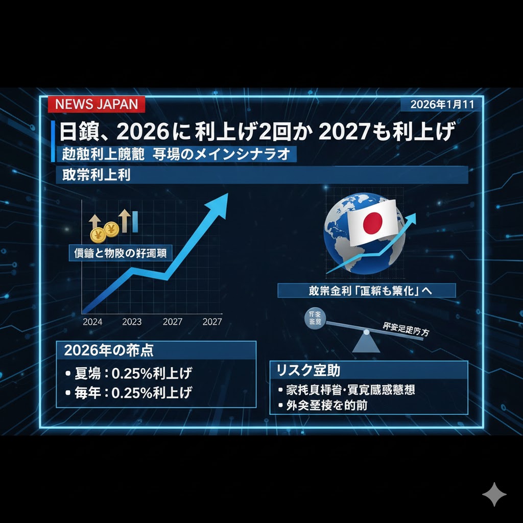 1: 2026/01/01(木) 20:10:58.59 ID:AAeyfnyG9 市場関係者の見方は以下の通り。 ◎日銀利上げは2回、長期金利は年前半に上昇・後半は米金利に追随しやや低下 <アセットマネジメントOne債 […]