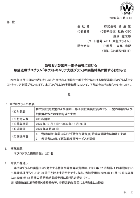 資生堂、令和6年日本事業で1500人、令和7年米国子会社で300人の人員削減。それでも足りず3月末で希望退職257人。7年12月期連結決算で過去最大520億円の最終赤字に転落。 — 流れゆく時のまにまに (@masuda_bruce) January 6, 2026 2026/01/06 資生堂 当社および国内一部子会社における希望退職プログラム「ネクストキャリア支援プラン」の実施結果に関するお知らせ https://corp.shiseido.com/ ※想定人数200名前後→257名 資生堂ひどいな何これ… — 新垢メタスラ(ベンツマン@株式板) (@Benzman_TAKE2) November 10, 2025 https://www.youtube.com/ 死生堂になったのか — 投資家モモンガ🍭 (@hanbuntoshika) November 10, 2025 資生堂の場合は日用品で頻繁に目にしてたからこそのブランドだったのにね。ウチの子供とかもう知らないと思うわ〜。その割にみなとみらいの展示はマス向けだし、戦略が噛み合って無さすぎた — めとろん (@me_tro) November 10, 2025 資生堂、魚谷雅彦というたった1人のガチ無能・銭ゲバでここまで没落するものなんだな — ゆな先生 (@JapanTank) November 10, 2025 https://www.youtube.com/ サラリーマンやってると『なんでこんなに仕事ができて人格者なのに主任止まりなんだろ』と思う人と『なんで何もできないし性格も終わってるコイツがこんな出世しているんだ』と思う人に多く出会うので、出世なんて所詮『運』だと思ってる。 — 品質さん (@chokyori_tsukin) August 2, 2025 これは会社を辞めた先輩から聞いた話ですが経営者が求める「経営者目線を持つ」とは、経営者のつもりになって行動することではなく、経営者にとって最も都合の良い自分の行動を考えて先回りすることであって間違っても会社経営に対する提言などしてはならないらしい — 筒井.xls@エクセル関数擬人化本著者 (@Tsutsui0524) May 29, 2025 「どうしたのコナン君?」「妙だな……ネクストステージ支援プログラム、セカンドキャリア支援制度、ネクストキャリア支援プラン、全部どこかで聞いたことある」 — raimon (@raimon49) December 17, 2025 ※主な有名企業の希望退職ネーミング集 ・資生堂(親会社)「ネクストキャリア支援プラン」 ・資生堂ジャパン(子会社)「ミライシフトNIPPON2025 ミライキャリアプラン」 ・電通「ライフシフトプラットフォーム」 ・NEC「セカンドキャリア支援制度」・東芝「新生東芝アクションプラン」・LIXIL「希望退職プログラム ニューライフ」 ・マツダ「セカンドキャリア支援制度」 ・富士通「セルフ・プロデュース支援制度」・オリンパス「社外転進支援プログラム・LINEヤフー「ネクストキャリア支援制度」 ・富士通「セルフ・プロデュース支援制度」 ・博報堂「ライフプラン選択支援制度」・フジテレビ「ネクストキャリア支援希望退職制度」 ・スタンレー電気「特別転進支援施策」 ・大和ハウス工業「キャリアデザイン支援制度」 ・廣済堂「社外転進支援プログラム」 ・リコー「セカンドキャリア支援制度」・ダイドーグループ「ライフシフト支援施策」 ・三菱電機「ネクストステージ支援制度特別措置」 ・ソニー「セカンドキャリア支援プログラム」・明治「ネクストキャリア特別支援施策」 ・コロプラ「キャリア転進支援制度」 ・三菱ケミカルグループ「ネクストステージ支援プログラム」 ・FDK「転進支援制度」 変な横文字使わず希望退職って言えよ — ユリス (@DRYH5) November 5, 2025 いい加減「人手不足」というのやめたら?「低賃金労働者不足」とハッキリ言え — 舞小海@衰退するのみ (@kufuidamema) November 14, 2025 贅沢な先進国の人間に結婚出産させるコストはうなぎ登りの一方で、発展途上国から連れて来る移民は二桁くらい安上がりで、ビザの権力で人権を制限して働かせられるのだよなぁ。 — スパゲッティモンスター (@spaghet76868452) March 22, 2025 サンリオのおかげでクビになる・リストラするを「おでかけしてもらう」と表現できるの良いわね — とあるコンサルタント (@consultnt_a) March 1, 2024 ※サンリオ、リストラの新しい隠語「おでかけ」を考案(2024/03/01) 勤続20年以上かつ45歳以上で早期おでかけ希望者1000人募集とかそういう表現になっていきますね。 — miyuyu💮. (@fusenuokun) March 2, 2024 おでかけなのに片道切符感がすごいわね — とあるコンサルタント (@consultnt_a) March 2, 2024 https://kabutan.jp/stock/chart?code=4911 Source: 市況かぶ全力2階建 投稿ナビゲーション 【日経先物下落】中国が日本に対し輸出規制強化 レアアース含む軍民両用品 “高市発言”への対抗措置 47都道府県でデパートがないのは山形県、岐阜県、島根県、徳島県で電車が走ってないのは徳島県だけ