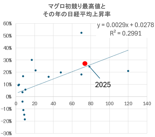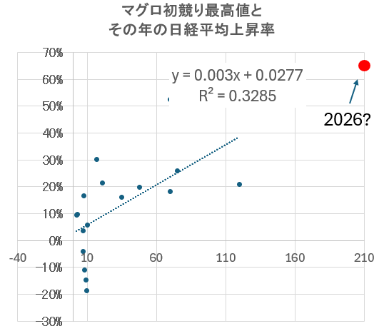 マグロ初競りのアノマリー、2026年はkgあたり210万円と、過去最大級のブッ飛んだ値となりました。昨年分も含めた統計で、日経平均株価 65.7% の上昇が期待できそうです!? https://t.co/35NqIHyGOs pic.twitter.com/9P6Ye9Q0k0