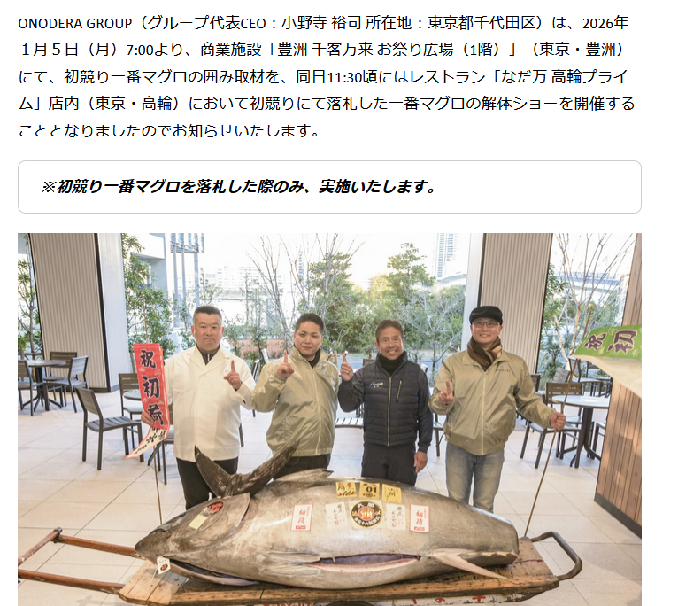 ここ数年は「なだ万」のonoderaグループが競り落としてて、今年も『初競りフェア』とかメディアを呼んでの解体ショーを予定してたのに、まさかの「すしざんまい」の5億入札ですべての予定が台無しにw pic.twitter.com/iRKz6Yxzib— まね™ (@mane247) January 5, 2026