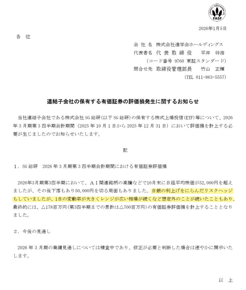 今回は利上げのリスクヘッジしたけど、レンジが広くて想定外のことが続いたせいらしい。 pic.twitter.com/rpM8t8tk73— 空き缶 (@akikankeri) January 5, 2026