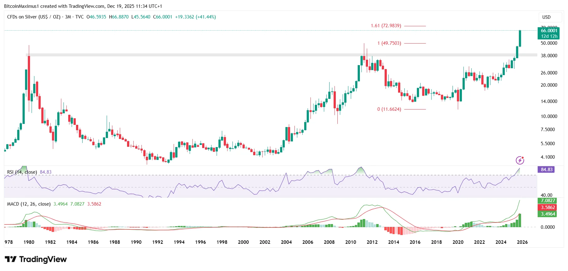 重要なポイント 銀は今日、史上最高値の66.50ドルを記録した。 金は史上最高値の4,380ドルより1.5%安く取引されている。 金は銀に続いて史上最高値を更新するでしょうか? 銀は正式に価格発見モードに入っています。 貴金属は水曜日に史上最高値の66.85ドルまで急騰し、数ヶ月にわたって積み上がってきた放物線状の上昇が継続した。 同時に、金は過去最高値からわずか1%低い水準で静かに推移しており、金属市場の次の段階を決定づける瞬間を迎えている。 銀がリードし、金がそれに続く中、投資家たちは今、重要な疑問を投げかけている。これは反落前の最後の上昇なのか、それとも貴金属全般にわたるより広範な上昇の始まりなのか? 銀が史上最高値を記録 2026年には銀の価格が大幅に上昇しました。 銀は38ドルの水平抵抗エリアを突破すると、放物線状に上昇した。 1980年以来、38ドルの水平抵抗が存在していたため、トレーダーらはブレイクアウトを大いに期待していた。 したがって、このような長期的な抵抗レベルからのブレイクアウトは、通常、大幅な上昇をもたらします。 モメンタム指標もこの急騰を裏付けている。 相対力指数(RSI)は70を超えています。 移動平均収束/発散 (MACD) は正です。 銀は本日、史上最高値を更新したが、最初の問題となる抵抗領域に近づいている。 しかし、銀は現在、最初の大きな技術的障害に近づいています。 72.90ドル付近にある1.61フィボナッチエクステンションは、利益確定と潜在的な反転が発生する可能性のある重要なゾーンを表しています。 シルバーの今後は? 短期的な見通しと波のカウントは、銀が近いうちにローカル高値に達する可能性が高いことを示しています。 銀は10月に始まった上昇傾向の第5波、そして最終波にある。 第 5 波は非常に伸長しており、価格がすぐに最高値に達する可能性が高いことを示しています。 短期チャートによれば、最高値となる可能性が最も高いエリアは、さまざまな 2.61 フィボナッチ拡張によって見つかる 69 ドルから 73 ドルの間です。 金は史上最高値を更新するでしょうか? 金の短期的な価格変動は銀の価格変動と非常に似ています。 価格は10月24日に始まった上昇の第5波であり最終波にあるとみられる。 しかし、銀とは異なり、上昇は平行チャネル内に収まっています。 今日、金は4,350ドルの水平抵抗エリアを上抜けて終値を付けようとしています。 それを上回って終値をつけようとする最初の試みは失敗に終わった。 成功すれば、金価格は4,400ドルを超える史上最高値を記録する可能性がある。 しかし、地層の形状から判断すると、金がこの水準を超えて大幅に上昇する可能性は低い。 むしろ、銀の上昇と同時期に、近いうちに局所的な高値に達する可能性がある。 貴金属にとってこれが何を意味するか 銀の史上最高値更新は歴史的なブレイクアウトを裏付けているが、技術的なシグナルは上昇局面が重要な局面に入っていることを示唆している。 金はまだ新たな高値を更新する余地があるが、両金属とも景気循環の初期段階の拡大ではなく、後期段階の勢いの兆候を示している。 これが急激な反落となるか、あるいは安定期間に終わるかによって、次の四半期に向けて貴金属の方向性が決まるだろう。 一つ明らかなことは、銀がリードしており、金がそれに追随するということ。 参考資料:https://www.ccn.com/analysis/business/silver-all-time-high-gold-price/ contents ●テレグラム始めました! https://t.me/joinchat/F-7ftRCH5u_8J7k2JUM1rw ●無料でLINE@で有益情報を随時流しています。 https://lin.ee/1rhkgzo ●過去の記事 http://ripple.2chblog.jp/ ■トレードするならバイナンス! https://www.binance.com/ ■yobit net https://yobit.net/en/ ●テレグラム始めました! https://t.me/joinchat/F-7ftRCH5u_8J7k2JUM1rw ●無料でLINE@で有益情報を随時流しています。 https://lin.ee/1rhkgzo ●過去の記事http://ripple.2chblog.jp/ ■トレードするならバイナンス!https://www.binance.com/■yobit nethttps://yobit.net/en/ Source: Rippleリップル)仮想通貨情報局 投稿ナビゲーション The ●●Bullet: 技術需要が劇的に増加する見込みで、価格が記録的な水準を超える 米国が9兆円超のビットコインを押収か、ベネズエラのマドゥロ大統領拘束で