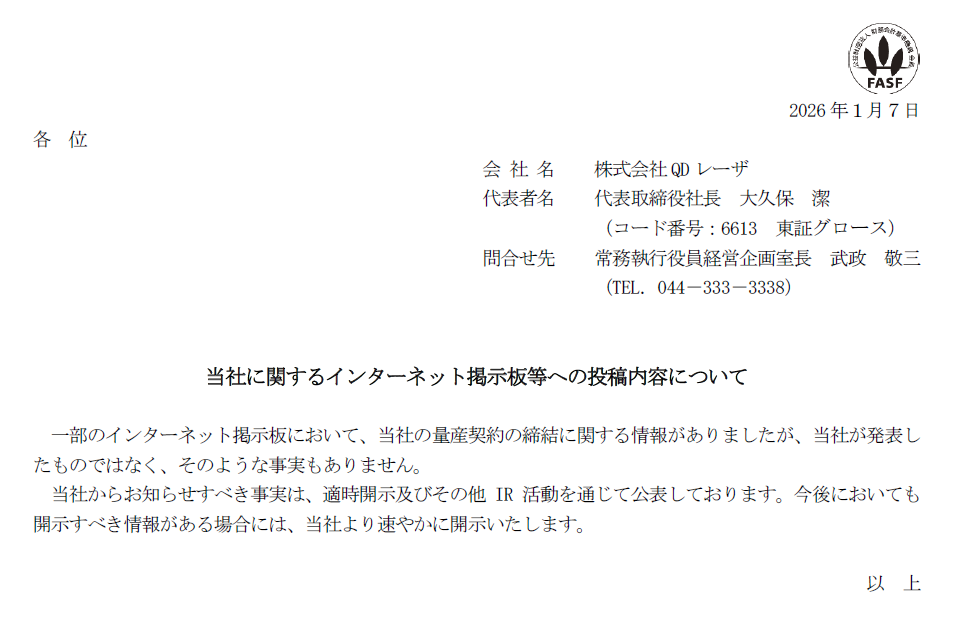 QDレーザ、インターネット掲示板等への投稿内容は事実無根 pic.twitter.com/nlhztusjtS