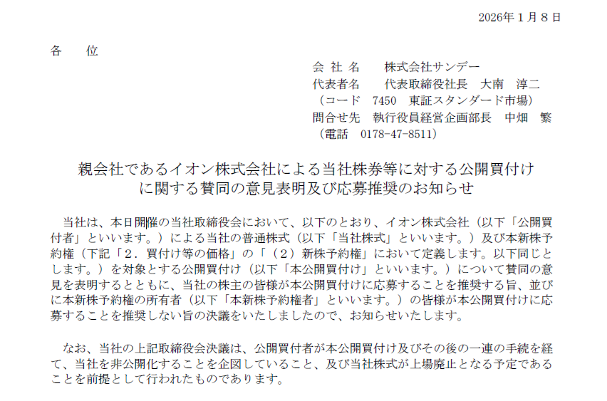 2026/01/08 サンデー親会社であるイオン株式会社による当社株券等に対する公開買付けに関する賛同の意見表明及び応募推奨のお知らせ