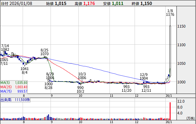 ※本日の終値 1,150円— 居残り佐平次🍥 (@inokori_3814) January 8, 2026