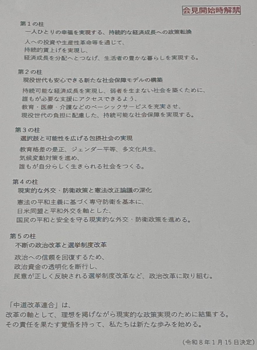 立憲民主、公明両党は19日の記者会見で新党「中道改革連合」の綱領を発表した。「生活者ファースト」などを掲げた。