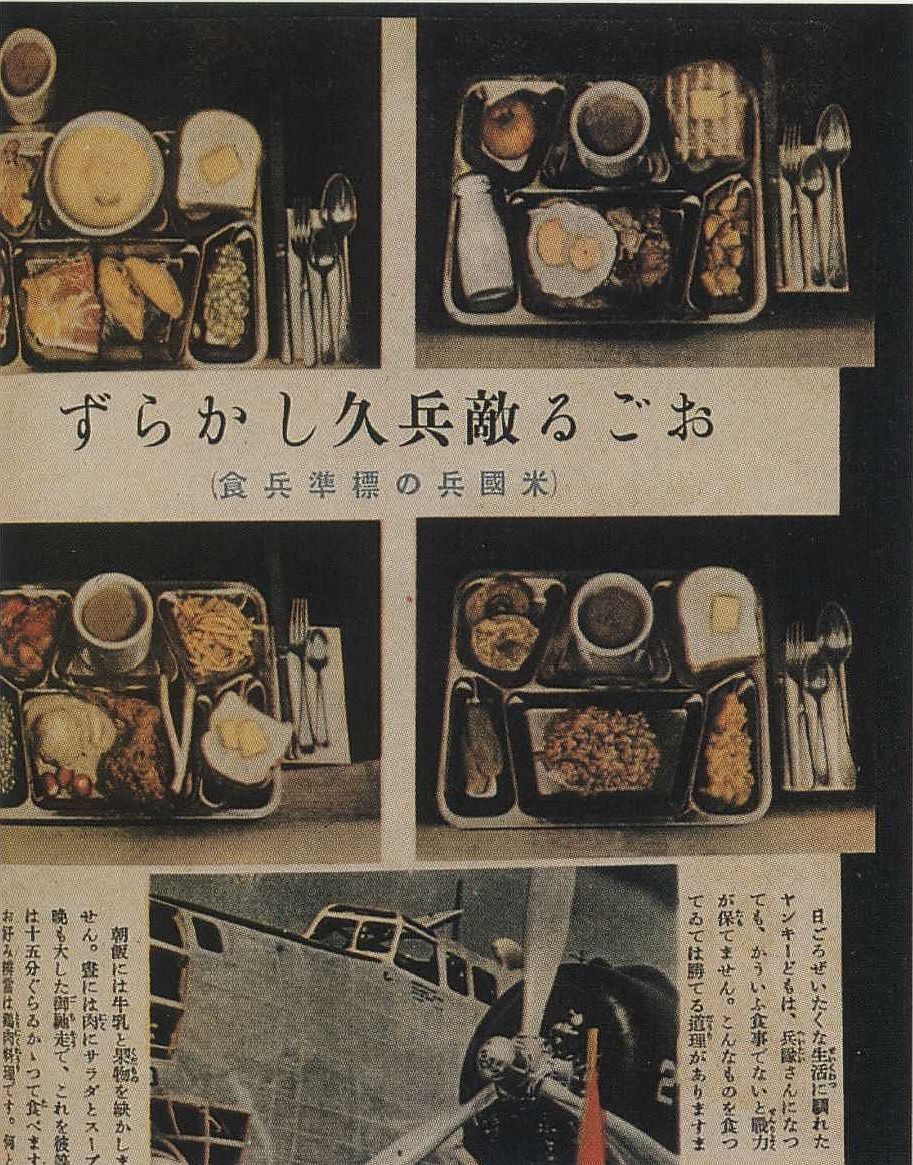 日ごろぜいたくな生活に馴れたアメリカ人どもは、兵隊さんになっても、こういう食事でないと戦力が保てません。こんなものを食つてゐては勝てる道理がありますまい。