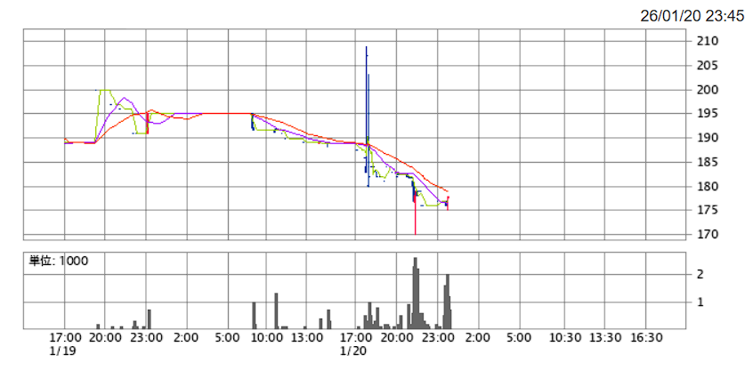 ※夜間取引市場で一瞬跳ね上がった後に下落
