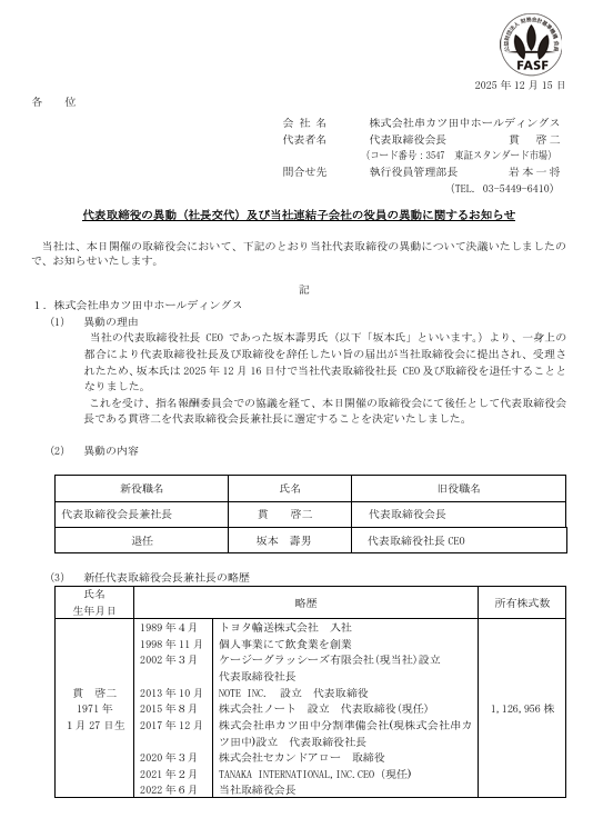 ※串カツ田中、1年の間に社長の坂本壽男さんと田中のルーツ兼副社長の田中洋江さんが一身上の都合を理由に相次いで辞任してしまう(2025/12/16)