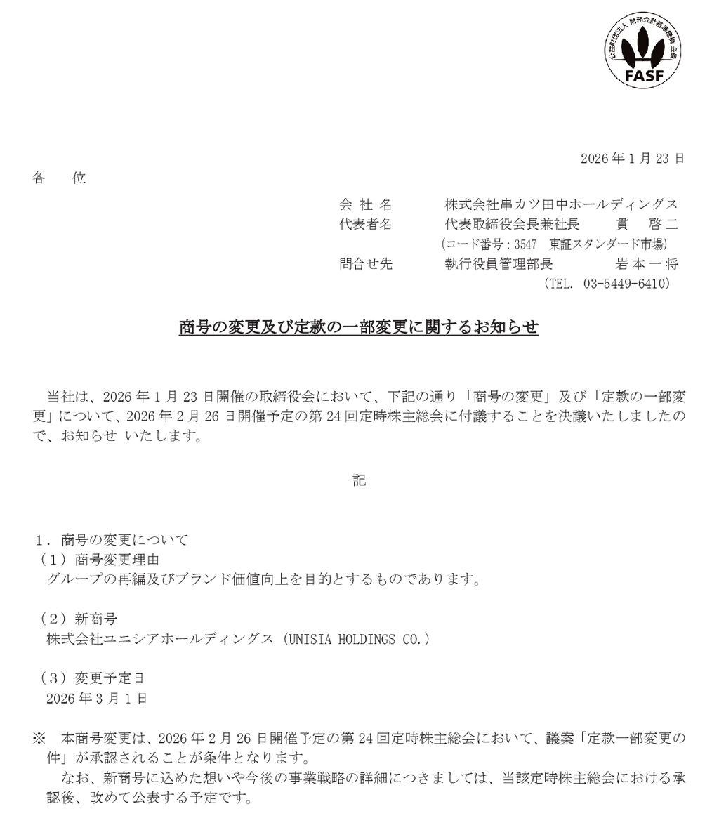 ・串カツ田中HD→ユニシアHD(2026年3月〜) ←New!— 官報ブログ (@kanpo_blog) January 23, 2026