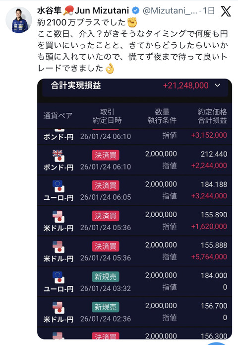 1: コイン速報がお伝えします 2026/01/24(土) 16:54:32.39 ID:Gmxk2L+Sr @Mizutani__Jun 約2100万プラスでした✊ ここ数日、介入?がきそうなタイミングで何度も円を買いにいったことと、きてからどうしたらいいかも頭に入れていたので、慌てず夜まで待って良いトレードできました👌 続きを読む Source: コイン速報 | 仮想通貨・暗号通貨・暗号資産ニュース 投稿ナビゲーション ロバート・キヨサキの歴史的な●●予測とビットコインのアドバイスを見てみる イーサリアムは2026年に●●万5000ドルに到達できるか?強気な幹部、予想に外れ「罰金」を要求