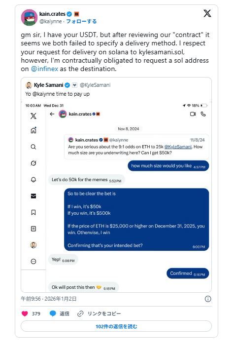 重要なポイント 注目を集める暗号通貨の価格賭けは高くつくことが判明している。 楽観的な見通しにもかかわらず、イーサリアムは下落して年末を迎えた。 公的な賭けは暗号通貨の文化的変化を強調する。 仮想通貨幹部による注目を集めた賭けが期限切れで失効したことを受け、イーサリアムの投資家らは再び高い価格目標について議論しており、ETHの価格に対する楽観論が現実を何度も上回ってきたことが浮き彫りになっている。 Infinexの創設者ケイン・ワーウィック氏は、イーサリアムが2025年末までに2万5000ドルに達すると予測した後、5万ドルの賭けを決着させる準備をしているが、最終的には700%以上の大差でその賭けは外れた。 イーサリアムの価格予想は失敗に終わった 2人の幹部は昨年、イーサリアムが急回復するだろうという新たな期待が高まる中、この賭けに出た。 この賭けは、ワーウィック氏とマルチコイン・キャピタルのマネージングパートナーであるカイル・サマニ氏との公開のやり取りから始まった。サマニ氏は、ETHが現実的に25,000ドルのレベルに達するほど早く回復できるかどうか疑問視していた。 ワーウィックは当初9対1のオッズで反対側に立ったが、後に両者は10対1で合意した。 「支払う時が来た」とサマニはXに書いた。イーサリアムが目標値に到達できなかった後、水曜日に。 ワーウィック氏は後に賭けの結果を認めたが、支払いをどう決済するかについて技術的な論争があったと指摘した。 「おはようございます。USDTを受け取りました」とワーウィックは返答した。 「しかし、『契約書』を確認したところ、どちらも配送方法を指定していなかったようです。」 ワーウィック氏は、資金をソラナブロックチェーン経由でkylesamani.solアドレスに送金してほしいというサマニ氏の要請を尊重すると述べたが、サマニ氏は別の送金先を要求していると付け加えた。 「契約上、宛先としてInfinex上のSolanaアドレスを要求する義務があります」とワーウィック氏は書いている。 報道時点では、イーサリアムは約3,047ドルです。 この失敗した賭けによって、イーサリアムが10年後にまだそのようなレベルに到達できるかどうかについての議論が再燃し、一部の投資家はタイムラインを2026年以降にずらしている。 CCNは、この強気な見方が妥当かどうかを評価するために、OpenAIのChatGPTとイーロン・マスクのGrokにイーサリアムの価格見通しについての見解を尋ねた。 ChatGPTの見解 ChatGPTは、イーサリアムの過去最高値をはるかに上回る価格目標には、感情や規制の漸進的な改善以上のものが必要になると警告した。 「イーサリアムはすでに、高い流動性、幅広い認知度、そして数年にわたる実績を備えた成熟した資産だ」とモデルは述べている。 「2万5000ドルへの上昇は発見によってもたらされるものではなく、ネットワークの価値の根本的な再評価が必要となるだろう。」 ChatGPTによると、このような価格変更は、イーサリアムの世界金融における役割が大規模に拡大しているという明確な証拠に依存するという。 「数兆ドルの評価額を正当化するために、イーサリアムはオンチェーン活動の持続的な成長、取引手数料からの実質的な収益、そしてネットワークに対する測定可能な機関の依存を必要とするだろう」と同社は述べた。 「2026年までにそれが実現できるでしょうか? 可能性はありますが、ほぼ完璧な実行力と非常に好ましいマクロ環境が必要になります。」 Grokの見通し グロク氏はより懐疑的な立場を取り、イーサリアムが2万5000ドルに達するとの期待は資産の現在の成熟度を過小評価しているのではないかと疑問を呈した。 「投資家がファンダメンタルズではなく物語を推測すると、こういうことが起こる」とグロック氏は述べた。「イーサリアムはもはや初期段階ではない。すでに重要なインフラとして価格設定されているのだ。」 チャットボットは、スポットETF、スケーリングのアップグレード、ステーキング参加の増加などの触媒はアクセスと効率性を向上させる可能性があるが、爆発的な価格上昇を保証するものではないと主張した。 「ETFは流通を改善し、アップグレードはスループットを向上させる。どちらも、イーサリアムの評価額を一夜にして3倍に押し上げるような市場を強制するものではない」と報告書は述べている。 グロク氏は、イーサリアムの長い取引履歴は追い風ではなく制約となる可能性があると付け加えた。 「7倍や8倍の値動きに賭けるということは、市場が10年近くイーサリアムの価値を根本的に誤解しているという前提に立っている」と同社は述べた。「それは大胆な仮定だ」 グロックは崩壊を予測するまでには至らなかったが、野心的な価格目標は加速期ではなく停滞期に近づくにつれて現れることが多いと警告した。 「市場は希望を無期限に報いるわけではない」と結論づけた。 イーサリアムの価格分析は暗い見通し テクニカル分析でも強気の予測とは反対の傾