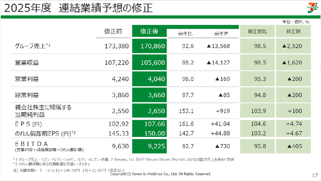 1: それでも動く名無し 2026/01/26(月) 07:36:08.48 ID:6u5dXIal0 (株)セブン&アイ・ホールディングス(東京都千代田区、スティーブン・ヘイズ・デイカス社長)は2026年2月期業績を下方修正した。 営業収益10兆5600億円(期初予想比98.5%)、 営業利益4040億円(95.3%) 経常利益3660億円(94.8%) 当期純利益2650億円(103.9%) グループ売上高は17兆3380億円の計画に対して17兆0860億円(98.5%)。 続きを読む Source: 哲学ニュースnwk 投稿ナビゲーション 【ネトウヨ朗報】クルド人JK「やはりこの国にわたしの居場所はないのでしょうか」 【衆院選】外国人「総量規制」は時期尚早 中道・野田氏、「多文化共生庁」の設置提起