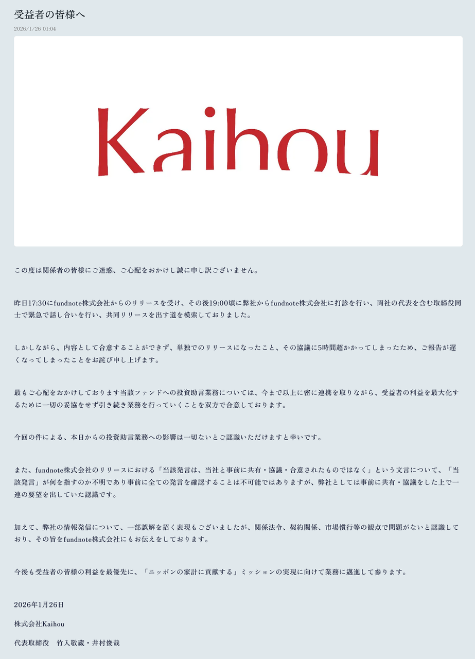 『fundnoteの多くの受益者の皆様にご迷惑、ご心配をおかけしている点につきまして、誠に申し訳ございません』『受益者保護および適正な情報開示の観点から、株式会社Kaihou社による情報発信のあり方について、関係法令、契約関係、市場慣行等の観点から確認を要する点があると当社は認識』