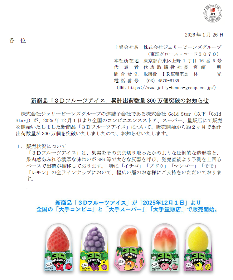 https://www.jelly-beans-group.co.jp/『販売開始から約2ヶ月で累計出荷数量が300万個を突破』
