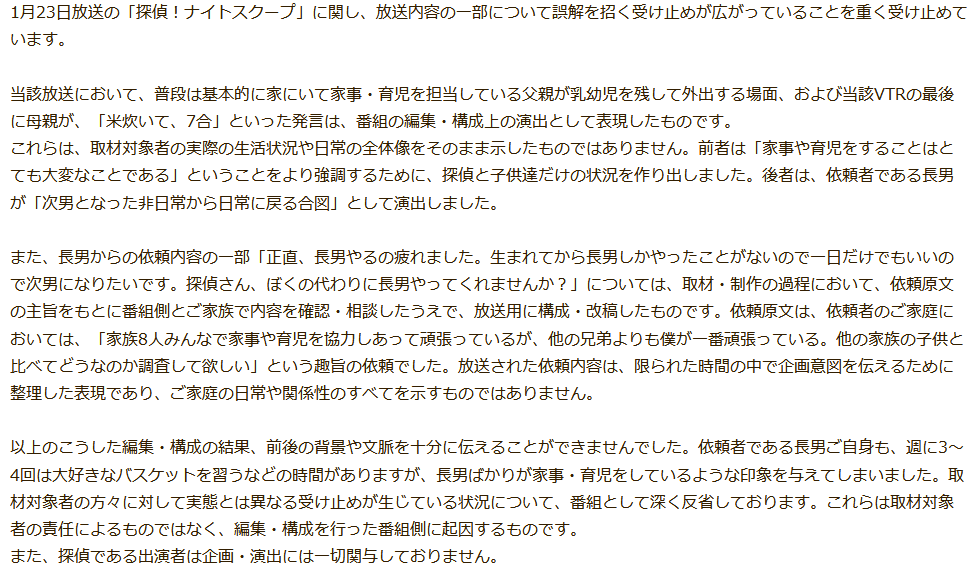 1月23日放送の「探偵!ナイトスクープ」に関し、放送内容の一部について誤解を招く受け止めが広がっていることを重く受け止めています。