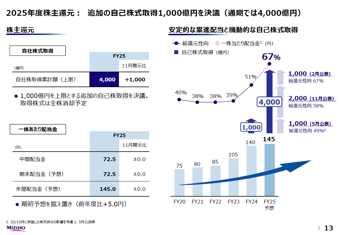 みずほFG第3四半期決算でまさかの追加株主還元サプライズ!!純利益1.01兆円でついに純利益1兆円台乗せ!!通期純利益予想1.13兆円に迫る勢い。そんな中で発表済みの自社株買い2000億円から1000億円追加で累計3000億円取得予定へ!!みずほFGがそんな動きを見せるとは!!驚き!!
