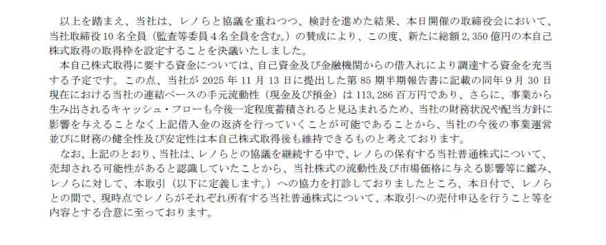 対抗策が決議されて差止の申し立てが認められなかった場合、不動産事業スピンオフに向けて具体的な準備した場合or DOE4%を下限とする株主還元方針を公表した場合— 辻元清美🇰🇵 (@re_ze_rou) December 24, 2025