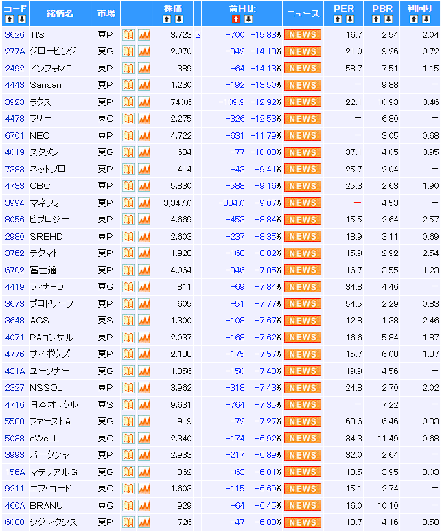 大半の株が上がってるのに一部のSaaSとかコンサルとかSIerとかエンタメ系だけがマイナス10%レベルで叩き売られている。