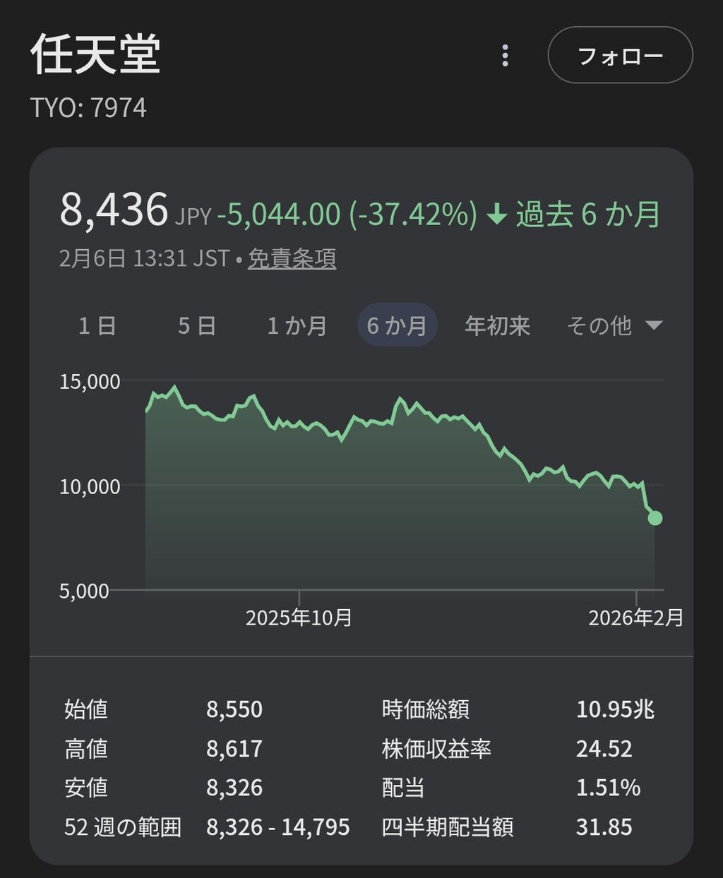 【悲報】任天堂さん、半年間で株価が「37%」下がっていたwwwww 2026年2月6日 稼げニュー 1: 2026/02/06(金) 13:48:29.90 続きを読む Source: 投資ちゃんねる – 株・FX・仮想通貨・投資2chまとめ 「冬の定期預金の金利が1%を超えてきた」 「「県立高校のトイレで殴る蹴る」動画 男子生徒を書類送検 傷害の疑い」 コメントをどうぞ 返信をキャンセルする。 名前 (必須) メールアドレス(公開されません) (必須) ウェブサイト コメント送信 Δ