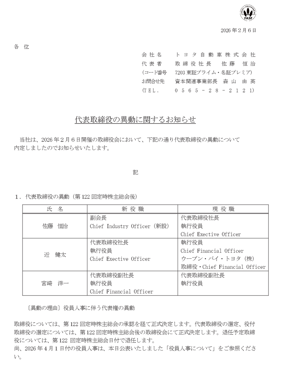 2026/02/06 トヨタ自動車代表取締役の異動に関するお知らせ