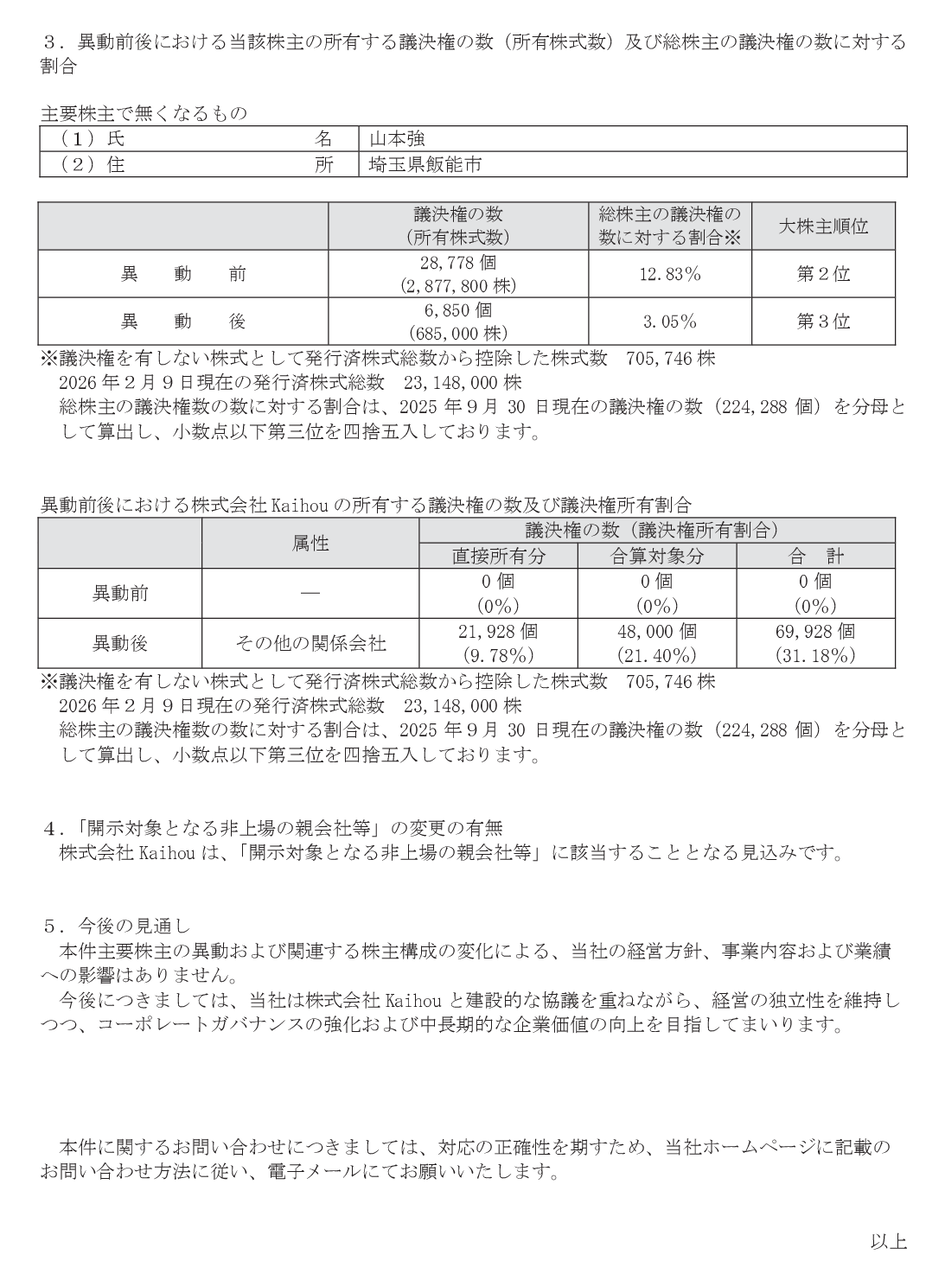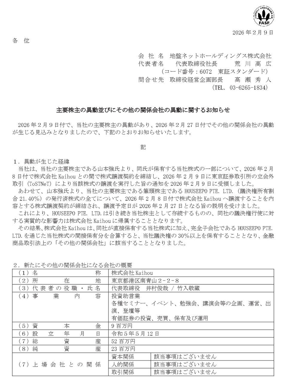 2026/02/09 地盤ネットホールディングス主要株主の異動並びにその他の関係会社の異動に関するお知らせ