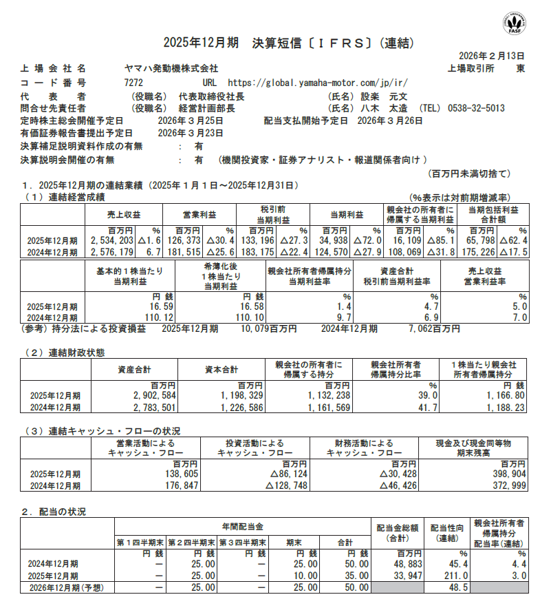 配当50円から35円に本日ヤマハ発動機
