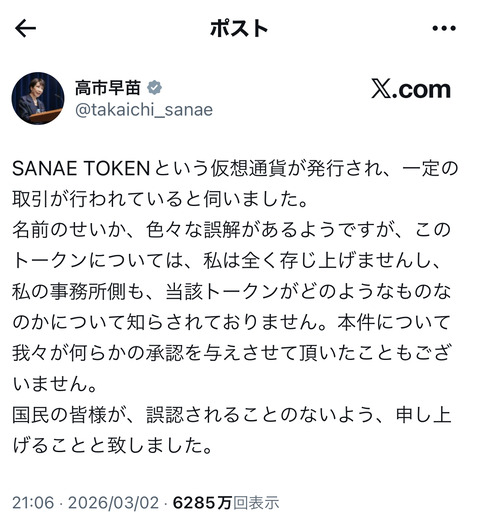 1: コイン速報がお伝えします 2026/03/02(月) 23:36:37.23 ID:RJ03zvS59 参照元:https://x.com/takaichi_sanae/status/2028441855227236653?s=46&t=GpVm2SK6OrYpdqqdp6sA9g 高市氏、仮想通貨「SANAE TOKEN」注意喚起 「存じ上げず」 | 毎日新聞 2026/3/2 23:07 高市早苗首相は2日、自身のX(ツイッター)への投稿で「SANAE TOKENという仮想通貨が発行され、一定の取引が行われているとうかがった」としたうえで「私は全く存じ上げない。国民の皆様が、誤認されることのないよう、申し上げることといたしました」と注意を呼びかけた。 高市氏は投稿で「名前のせいか、色々な誤解があるようですが、このトークンについては、私は全く存じ上げませんし、私の事務所側も、当該トークンがどのようなものなのかについて知らされておりません。本件について我々が何らかの承認を与えさせて頂いたこともございません」と述べた。 https://mainichi.jp/articles/20260302/k00/00m/010/321000c 続きを読む Source: コイン速報 | 仮想通貨・暗号通貨・暗号資産ニュース 投稿ナビゲーション Rippleがヨーロッパで初のアセットマネージャー契約を獲得、XRPLは●●規模を目指す Rippleが●●の銀行との関係を深化し、Zandとステーブルコインの取り組みを模索