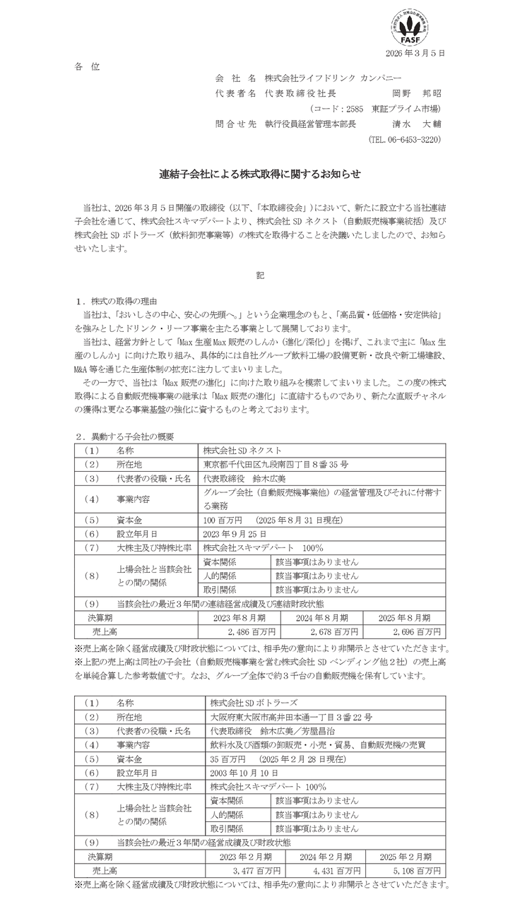ライフドリンク、格安自販機のスキマデパートから自販機関連会社2社を非開示価格で買収(100%)