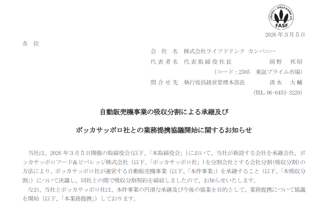 ライフドリンク、ポッカサッポロからも自販機事業を10月に取得予定、稼働台数は約4万台