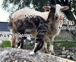 羊と猫の椅子取りゲーム。岩を独り占めしたい羊と猫の攻防戦が面白い