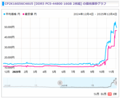 ちょっと流石にメモリの値段狂ってるDDR5の価格推移グラフ、北から見た南アメリカ大陸の断面かと思ったわ — 747_200Japan (@747_200Japan) November 30, 2025 https://k・・・