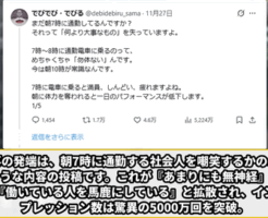 食うために朝から仕事行ってんのに『まだ朝7時の通勤電車で消耗してるの?』でバチ切れるの、何かおかしなことですかねって思いました。なんで朝もはよから情報商材屋構文で煽られないといかんのですかい — ktgohan (@kt・・・